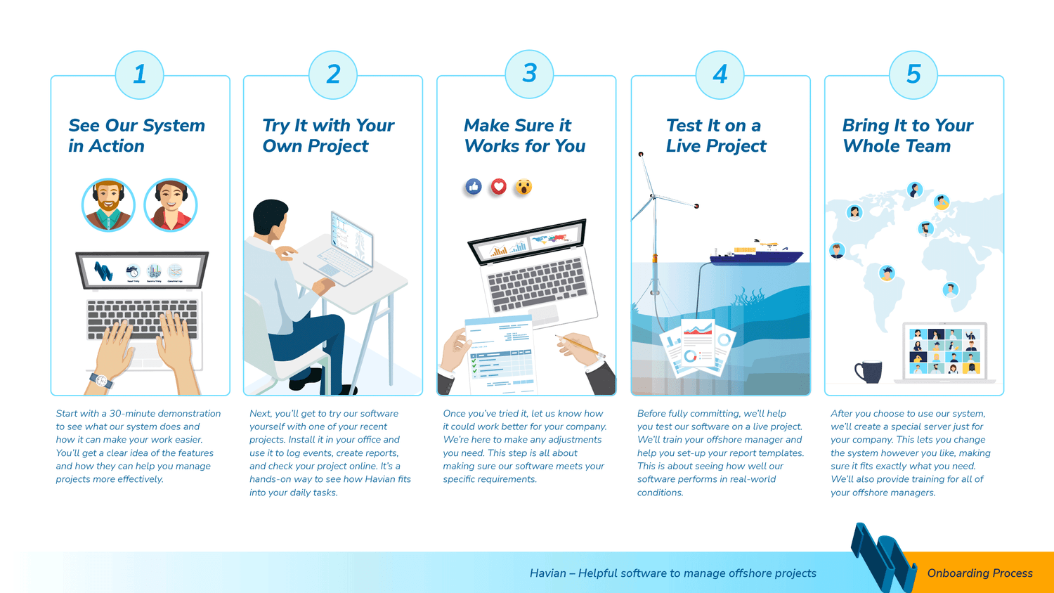Les om de ulike stegene over. Denne gjengen vet hva kundeservice handler om! Disse illustrasjonene ble laget som en oppdatering til brosjyren for å illustrere hvordan man kommer i gang med Havian sine tjenester.