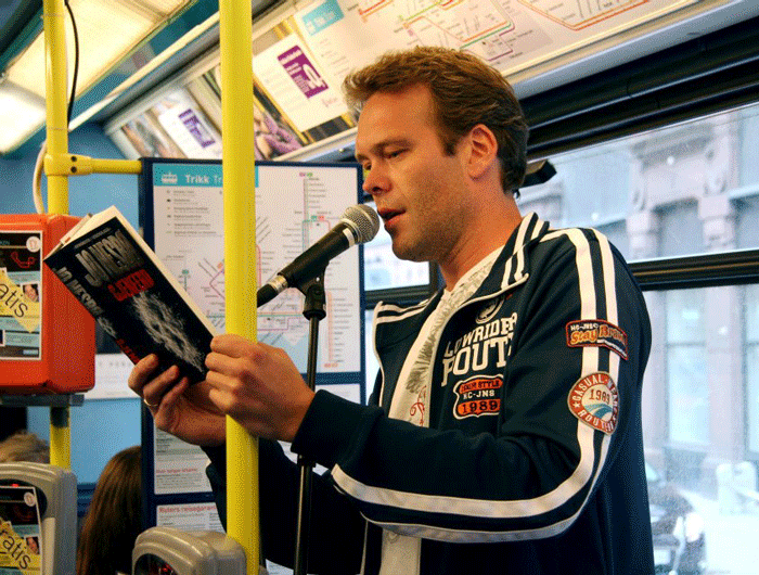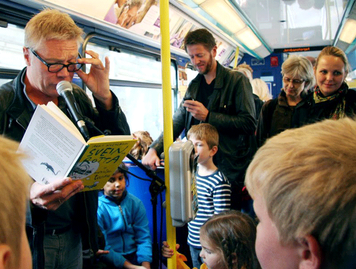 Frokosttrikk med høytlesning fra kjente romaner, her: Kim Haugen leser fra Alkymisten av Paulo Coelhos.