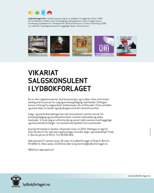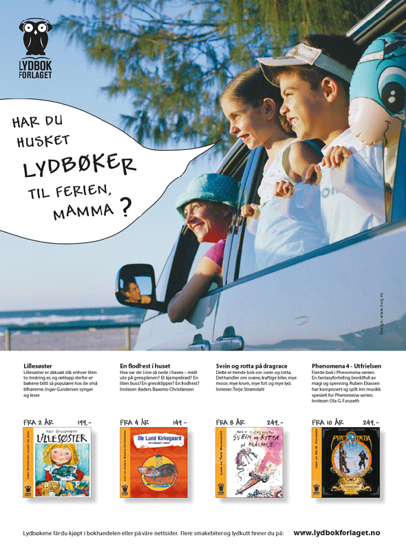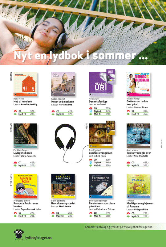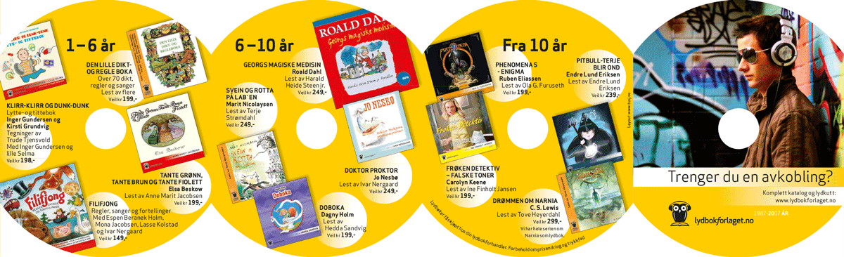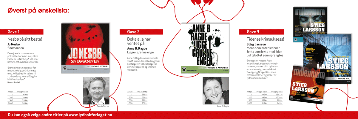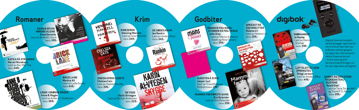 For Lydbokforlaget laget vi et bredt spekter av markedsmateriell: annonsekampanjer, brosjyrer, plakater og CD-cover – alt skreddersydd for å gjøre lydbokopplevelsen levende og tilgjengelig for flere.