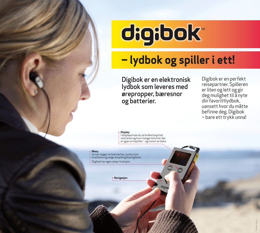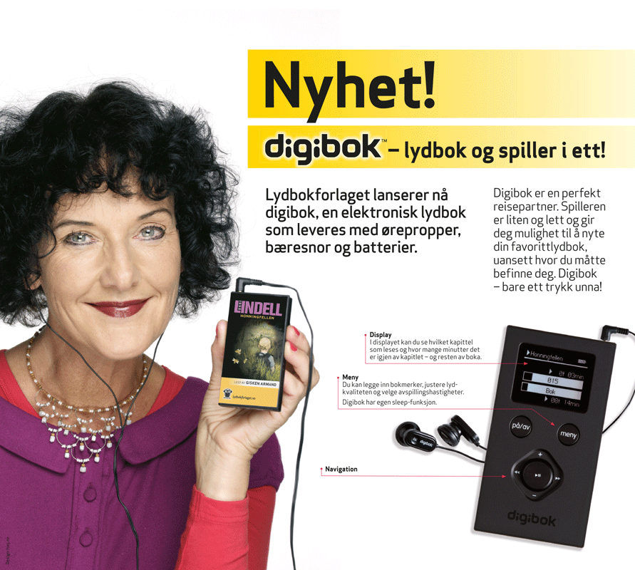Plakat og displaymateriell – til høyre presentert av forfatteren Unni Lindell. Digiboken ble lansert på slutten av 2007. Nå kunne folk få både spiller og lytteopplevelsen i ett.