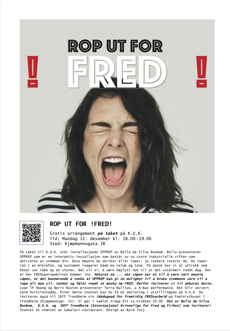 Etter dette stuntet kan du få en omvisning i utstillingene på K.U.K. Du inviteres også til IKFF Trondheim sin idédugnad for fremtidig FREDsarbeid på Feministhuset i Trondheim (Kjøpmannsgt. 51). Vi går i samlet tropp dit ca klokken 19.00.